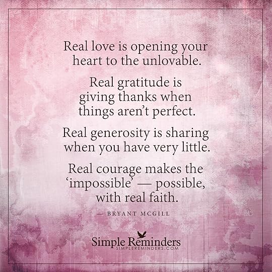 "Real love is opening your heart to the unlovable. Real gratitude is giving thanks when things aren't perfect. Real generosity is sharing when you have very little. Real courage makes the 'impossible' — possible, with real faith."