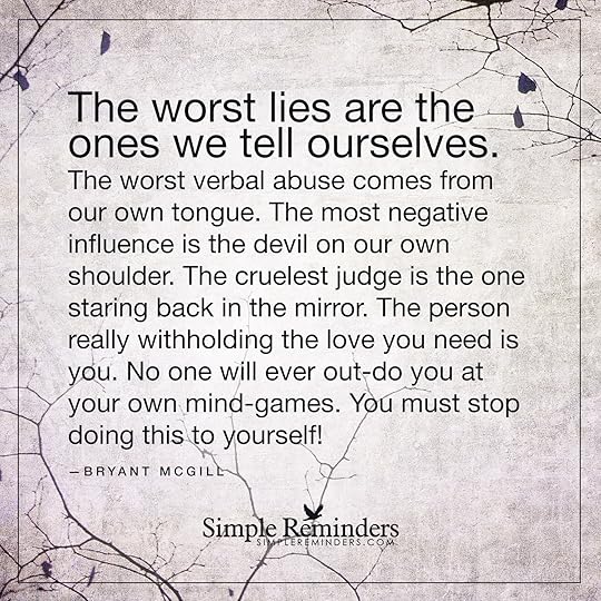 "The worst lies are the ones we tell ourselves. The worst verbal abuse comes from our own tongue. The most negative influence is the devil on our own shoulder. The cruelest judge is the one staring back in the mirror. The person really withholding the love you need is you. No one will ever out-do you at your own mind-games. You must stop doing this to yourself!"