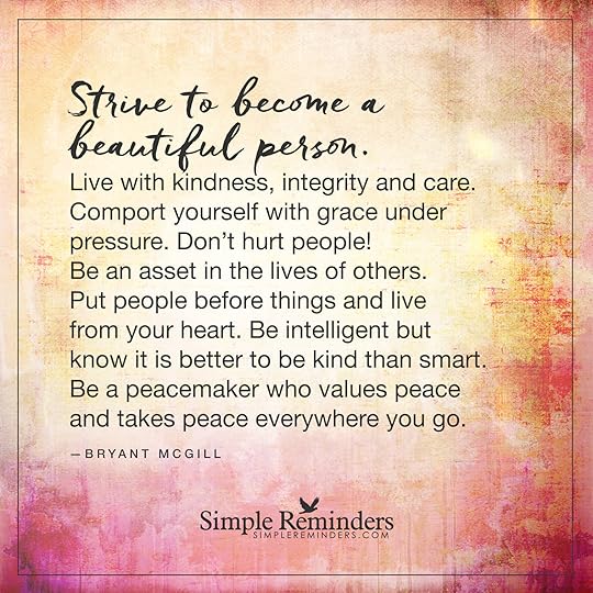 "Strive to become a beautiful person. Live with kindness, integrity and care. Comport yourself with grace under pressure. Don't hurt people! Be an asset in the lives of others. Put people before things and live from your heart. Be intelligent but know it is better to be kind than smart. Be a peacemaker who values peace and takes peace everywhere you go."