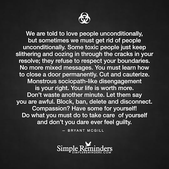 "We are told to love people unconditionally, but sometimes we must get rid of people unconditionally. Some toxic people just keep slithering and oozing in through the cracks in your resolve; they refuse to respect your boundaries. No more mixed messages. You must learn how to close a door permanently. Cut and cauterize. Monstrous sociopath-like disengagement is your right. Your life is worth more. Don't waste another minute. Let them say you are awful. Block, ban, delete and disconnect. Compa...