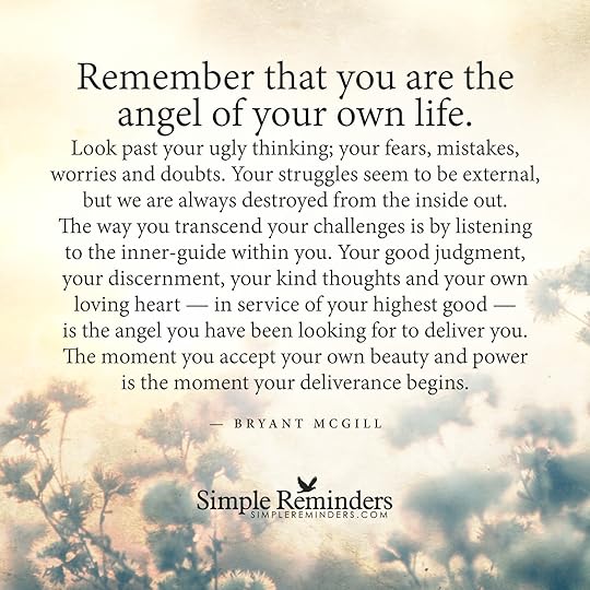 "Remember that you are the angel of your own life. Look past your ugly thinking; your fears, mistakes, worries and doubts. Your struggles seem to be external, but we are always destroyed from the inside out. The way you transcend your challenges is by listening to the inner-guide within you. Your good judgment, your discernment, your kind thoughts and your own loving heart — in service of your highest good — is the angel you have been looking for to deliver you. The moment you accept your own...