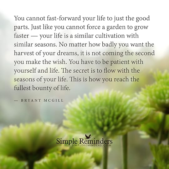 "You cannot fast-forward your life to just the good parts. Just like you cannot force a garden to grow faster — your life is a similar cultivation with similar seasons. No matter how badly you want the harvest of your dreams, it is not coming the second you make the wish. You have to be patient with yourself and life. The secret is to flow with the seasons of your life. This is how you reach the fullest bounty of life."