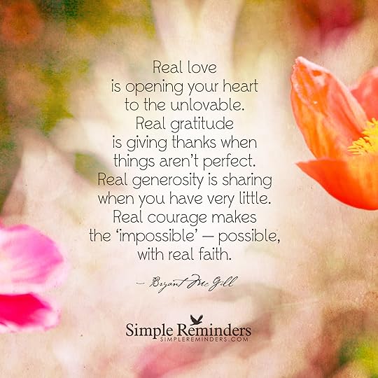 "Real love is opening your heart to the unlovable. Real gratitude is giving thanks when things aren't perfect. Real generosity is sharing when you have very little. Real courage makes the 'impossible' — possible, with real faith."