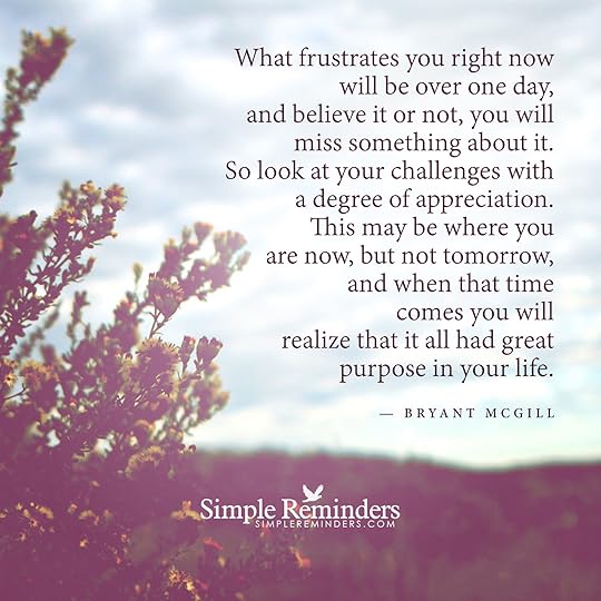 "What frustrates you right now will be over one day, and believe it or not, you will miss something about it. So look at your challenges with a degree of appreciation. This may be where you are now, but not tomorrow, and when that time comes you will realize that it all had great purpose in your life."