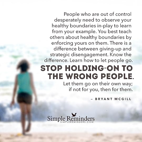 "People who are out of control desperately need to observe your healthy boundaries in-play to learn from your example. You best teach others about healthy boundaries by enforcing yours on them. There is a difference between giving-up and strategic disengagement. Know the difference. Learn how to let people go. Stop holding-on to the wrong people. Let them go on their own way; if not for you, then for them."