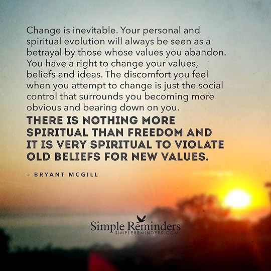 "Change is inevitable. Your personal and spiritual evolution will always be seen as a betrayal by those whose values you abandon. You have a right to change your values, beliefs and ideas. The discomfort you feel when you attempt to change is just the social control that surrounds you becoming more obvious and bearing down on you. There is nothing more spiritual than freedom and it is very spiritual to violate old beliefs for new values."