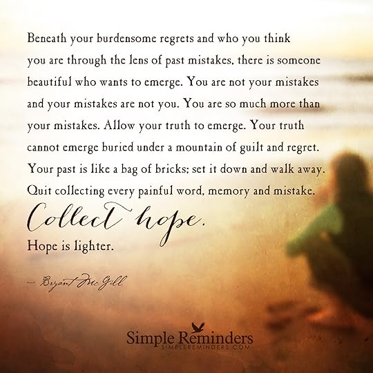 "Beneath your burdensome regrets and who you think you are through the lens of past mistakes, there is someone beautiful who wants to emerge. You are not your mistakes and your mistakes are not you. You are so much more than your mistakes. Allow your truth to emerge. Your truth cannot emerge buried under a mountain of guilt and regret. Your past is like a bag of bricks; set it down and walk away. Quit collecting every painful word, memory and mistake. Collect hope. Hope is lighter."