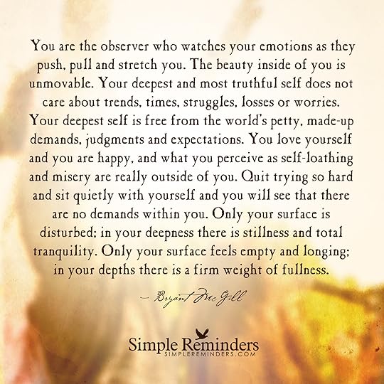 "You are the observer who watches your emotions as they push, pull and stretch you. The beauty inside of you is unmovable. Your deepest and most truthful self does not care about trends, times, struggles, losses or worries. Your deepest self is free from the world's petty, made-up demands, judgments and expectations. You love yourself and you are happy, and what you perceive as self-loathing and misery are really outside of you. Quit trying so hard and sit quietly with yourself and you will...