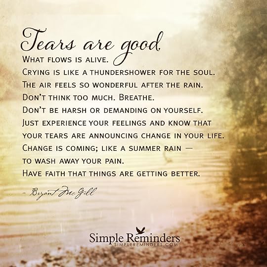 "Tears are good. What flows is alive. Crying is like a thundershower for the soul. The air feels so wonderful after the rain. Don't think too much. Breathe. Don't be harsh or demanding on yourself. Just experience your feelings and know that your tears are announcing change in your life. Change is coming; like a summer rain — to wash away your pain. Have faith that things are getting better."
