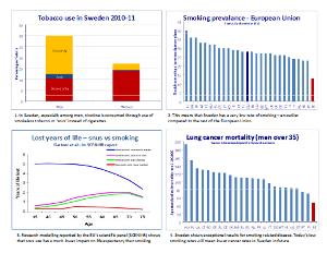 Here is also a pdf with diagrams (from the same experts) that illustrate the success story of snus as a means for reducing smoking, and thus smoking related diseases, in Sweden.