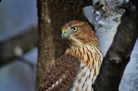 Cooper’s Hawk photo by Tom Berriman, used with permissionIn Nighthawk’s Wing, Gideon and his wife True listen to a story told by True’s gram (that’s what folks call a grandmother in central Pennsylvania) while sitting around a fire at night listening to that ratcheting chorus: “They say the katydids tell a story,” Gram Burns said. “Two sisters fell in love with the same man, and Katy was the one who didn’t win his heart. Later, the man and the other sister died – they were poisoned. The insects in the trees kept saying ‘Katy-did!’ because Katy was the one who murdered them.”