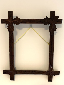 I did a lot of research about tramp art which led me to eBay which led me to a purchase. Imagine that — the sacrifices I make for my art. I bought three frames that were grouped together. They are all about 12 1/4 by 10 1/2. Here is one of them: