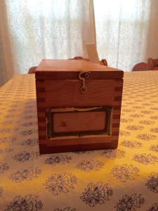 [image error]I found this old wooden box at a garage sale and fell in love with it. It might be from a library but I use it to store bookmarks and business cards.