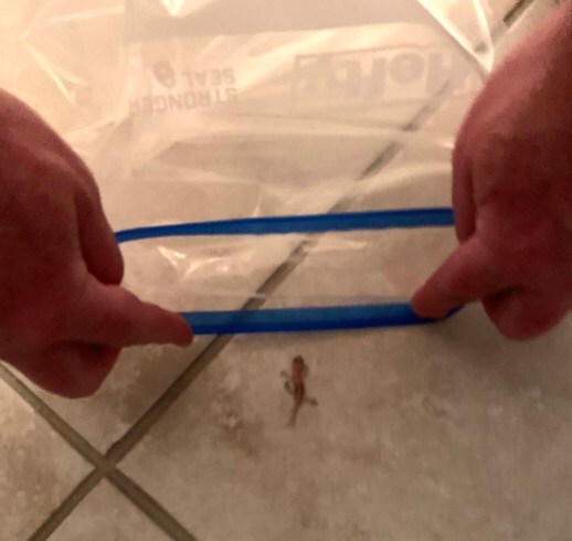 It wouldn’t be life in Florida without a lizard in the house. This tiny lizard didn’t want to get in the bag, but he did and then was released back into the wild.