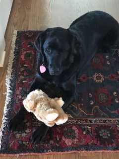 My new dog Ebby with her teddy. Ebby is former courthouse dog, like Hope.A real-life galumphing black dog named Chuckles was a model of attunement when he watched his human, who’d just had a chemo infusion, collapse on her sofa one afternoon and cry until she fell asleep. When she woke, Chuckles was waiting, and she was covered with a squeaky carrot, balding teddy bear, decapitated tiger, and worn-out tennis balls. The woman said, “Chuckles brought me all his toys to comfort me. He gave me everything he had.”