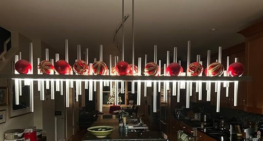 Barbara: For this post, I chose something new, not a cherished family heirloom. One of the few renovations my husband and I have done in our current place is an upgrade of the lighting on the living floor, including this chandelier over the dining table. Last year I had the idea to add Christmas balls to it during the holiday season. Normally, I think it looks like a cityscape, but with the balls added, it looks to me like icicles.