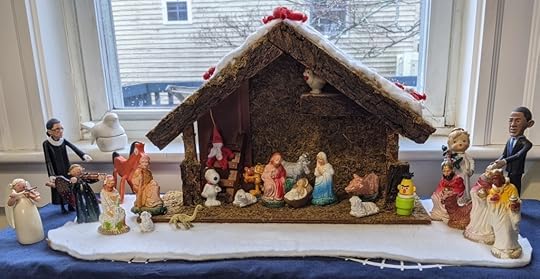 Edith: My nativity scene holds so many memories, past and present. My mother painted the traditional figures, and they were the ones we set out every year when I was a child. My older sister, Barbara (a big fan of all the Wickeds’ cozies) got the set and used it with her four sons, but after I had my own young family, she passed it along to us. She also sent me the red yarn elves when we lived in Mali for a year and had zero Christmas decorations. About ten years ago I found Snoopy in a box and added him, and then Garfield and Bert. Now I love to add other figures as I come across them (which is how RBG and Obama joined the birthday party).