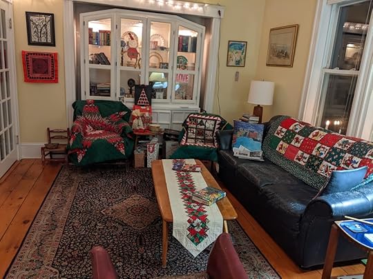 In my house, we won’t see my older son and his wife until Thursday, because they were with her family for the holiday. I’m leaving up the decorations, most of which my mom made with her talent with fabrics.