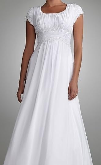 First, let’s talk dresses. Our hero, Robbie, has long been described as about 5’3″, with a small waist and hearty hips anchoring her bicyclist’s thighs. She wanted to find a dress to highlight her best attributes. What bride doesn’t want that? Aunt Adele and Robbie’s friend Lou went shopping with her.