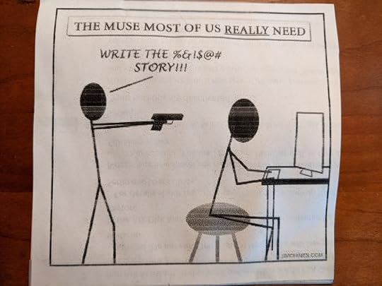 Me: “After I woke up this morning, my muse kindly passed along six ideas for how to improve the book.”
