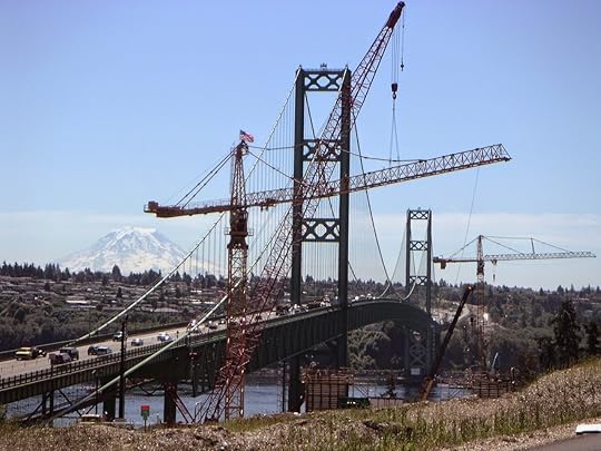New Tacoma Narrows Bridge Under Construction (One of the Last Big Jobs) Those aluminum-and-steel concrete forms peeking up over the knoll in the foreground were provided by me in one of my former roles as a sales rep for a large formwork vendor. It was one of Beamwalker's last big jobs in construction. But certainly not the last big job! - I've been busy finishing and editing Skyshooter for release in April, and that is a far greater challenge!