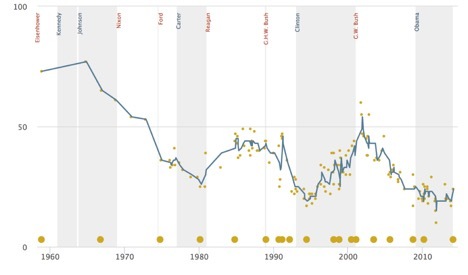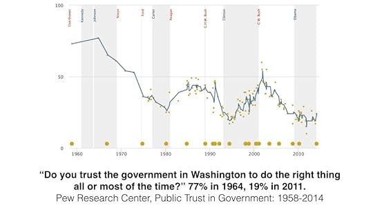 Since 1958, the National Election Study and other pollsters have asked a sample of Americans the following question: “Do you trust the government in Washington to do the right thing all or most of the time?” Trust peaked during the Johnson administration in 1964, at 77%. It declined precipitously under Nixon, Ford and Carter, recovered somewhat under Reagan, and nose-dived under George HW Bush. Trust rose through Clinton’s presidency and peaked just after George W. Bush led the country into war in Iraq and Afghanistan, collapsing throughout his presidency to the sub-25% levels that characterized Obama’s years in office. Between Johnson and Obama, American attitudes towards Washington reversed themselves – in the mid 1960s, it was as difficult to find someone with low trust in the federal government as it is difficult today to find someone who deeply trusts the government.