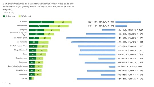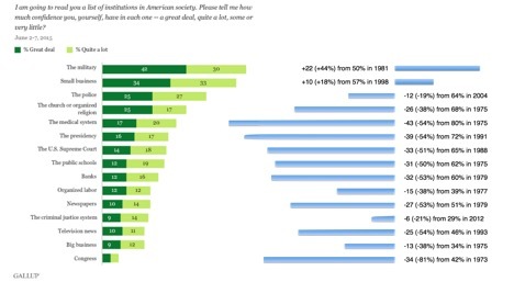 Declining trust in government, especially in Congress – the least trusted branch of our tripartite system – is an old story, and generations of politicians have run against Washington, taking advantage of the tendency for Americans to re-elect their representatives while condemning Congress as a whole. What’s more surprising is the slide in confidence in institutions of all sorts. Trust in public schools has dropped from 62% in 1975 to 31% now, while confidence in the medical system has fallen from 80% to 37% in the same time period. We see significant decreases in confidence in organized religion, banks, organized labor, the criminal justice system and in big business. The only institutions that have increased in trust in Gallup’s surveys are the military, which faced Vietnam-era skepticism when Gallup began its questioning, and small business, which is less a conventional institution than the invitation to imagine an individual businessperson. With the exception of the military, Americans show themselves to be increasingly skeptical of large or bureaucratic institutions, from courts to churches.