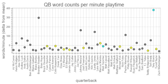 We analyzed how much media attention each of the 53 quarterbacks in our study received. To adjust for the fact that some quarterbacks in our set played very few minutes, we calculated words per minute played, a statistic that ranged from 25.5 words/minute for Titans backup Zack Mettenberger, to 471.4 words/minute for the Cowboys Tony Romo, who suffered a shoulder injury and missed most of the season, to the great dismay of the Dallas press. While Romo is the largest outlier in the set, five other quarterbacks – all white – received unusually high words per minute scores: Brandon Weeden, Johnny Manziel, Landry Jones, Peyton Manning and Tom Brady. The first three – Weeden, Manziel and Jones – played very few games – Jones was a substitute in a single game, while Weeden and Manziel started fewer than 3 games in a 16 game season – skewing these counts. Manning and Brady are “name-brand” quarterbacks, who received additional attention in 2015, Brady for the ongoing “Deflategate” saga and Manning for winning the Super Bowl and retiring.