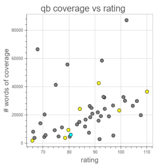 Given all of the above, there’s an argument that black quarterbacks are genuinely more athletic – at least in terms of foot speed – than white quarterbacks, and the differences we see in language about quarterbacks may correlate to their performance. That may run counter to suspicions that led Dori to ask her question. But we did find a way in which there’s an apparent racial disparity in coverage: sheer attention.
