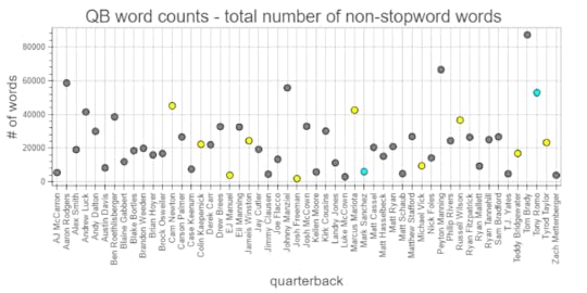 Only eight quarterbacks broke the 40,000 word barrier in our set, two black, one hispanic, five white. Set the bar at 50,000 and we’re down to four white QBs and Tony Romo. At the highest levels of attention, four “name-brand” quarterbacks (Rodgers, Brady, Manning, Romo) and one screw-up (Manziel) dominate discussion of football in 2015-6. Elite black QBs – Russell Wilson, Marcus Mariotta, Cam Newton – received more attention than mediocre quarterbacks, but less than name brand, endorsement laden white QBs, despite in Wilson’s case, significantly superior performance.