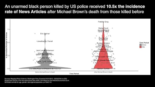 After Mike Brown, that curve’s very different. There are a lot fewer people who are invisible. Basically, if you get shot by the police as an unarmed person of color, there is going to be a story about it, whether or not it makes it up to the national level, that invisibility starts going away. In fact, that invisibility goes away in such a big way, or to quote my new political leader, “So bigly, so hugely,” that you have 10 times as much coverage shortly after Mike Brown’s death for the average person of color killed by police than you did before.