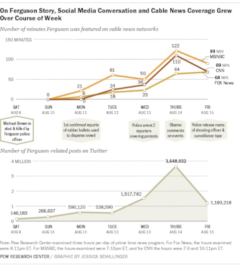 The Pew Research Center confirms this picture. In a thorough analysis of early media coverage of the events in Ferguson, Paul Hitlin and Nancy Vogt of Pew note that cable news didn’t report the story until Monday the 11th, two days after the shooting. Cable news attention peaked on Thursday, August 14, after Ferguson police arrested two reporters and President Obama interrupted his vacation to report on the situation. Twitter attention peaked at the same time, with 3.6 million Ferguson-related tweets on the 14th, but it’s worth noting that Twitter showed a steady and growing interest in the topic from Saturday the 9th onward.