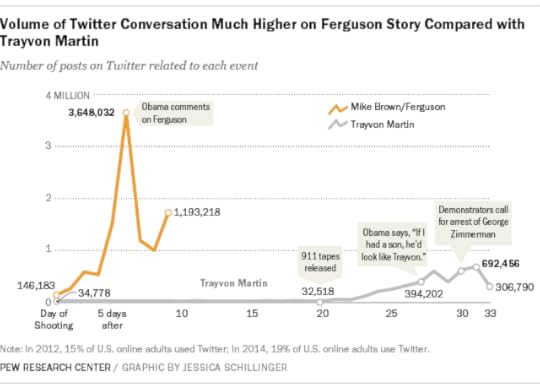 Pew’s analysis of Michael Brown versus Trayvon Martin shows that attention to events in Ferguson built more quickly than attention to events in Stanford, FL. There are several reasons for this. The police response to protests added a dimension to the Ferguson story that was not present in discussions of Trayvon Martin – many of the tweets on August 14 focused on the arrest of working journalists and the use of military equipment by Ferguson police. (When Missouri Highway Patrol Captain Ron Johnson took over control of law enforcement response in Ferguson on August 14, ordering officers to remove riot gear, attention on Twitter dropped sharply, suggesting some of the attention was on policing tactics.)