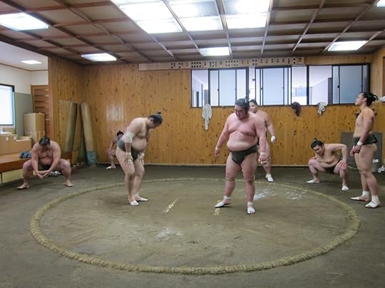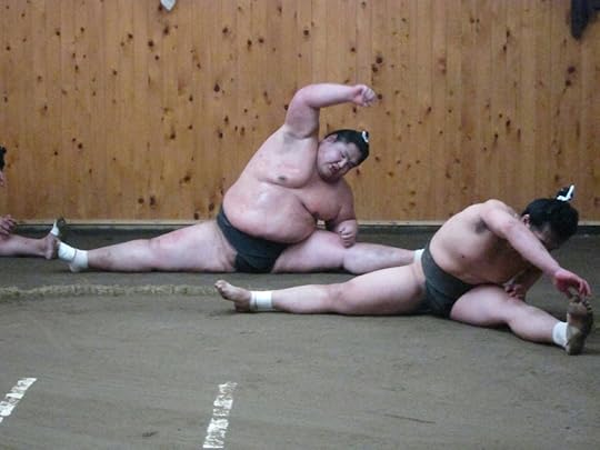 I’m a large man, just under the mass of some of the lightest sumo wrestlers. (There’s one remarkably brave Czech, Takanoyama, who fights at 100kg, way lighter than I am.) I guess I’d assumed that sumo wrestlers were similar to football’s offensive linemen, who are massive and broad men, sometimes with a layer of fat covering powerful frames. But the sumo body is different – these guys are small, muscular guys who’ve added 100kg to their frames through a strict dietary regimen. Most return to a normal weight that’s half of their fighting weight. Until watching a young man who hadn’t yet gained his fighting mass work out, I hadn’t understood that sumo is, in effect, a form of extreme body modification.