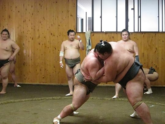 My younger Japanese friends are always baffled that I’m fascinated by sumo – it’s something their grandfathers watched, not something they pay attention to. My older Japanese friends tend to assume that it’s part of a respectful attitude towards Japanese culture, and then are surprised that I’m knowledgeable about sumo and ignorant of much of what’s rich and engaging about that endlessly fascinating nation. For me, the beauty of sumo is that it’s so simple – two big men pushing each other around – and so complicated, in terms of techniques, of bodies and of global economics.