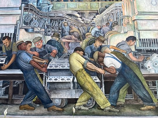 What’s most enticing to me about Detroit – and other legacy cities – is the ability to move from contemporary creativity to historic creativity. It’s a ten minute drive from the African Bead Museum to the Detroit Institute of Arts, one of the few museums where a Van Gogh self-portrait gets upstaged by the mural in the adjacent room. The mural is Diego Rivera’s Detroit Industry, and it’s almost indescribable. It’s both an awestruck portrait of the industrial might of Detroit’s auto industry in the 1930s, and a howl of communist rage at the juxtaposition of worker solidarity and capitalist greed. Black, brown and white workers put sculpted shoulders to the wheel as frowning, suit-clad bosses monitor their every move. The two largest panels depict Ford’s then-non-union River Rouge plant, and it’s apparent that Rivera was following the march of unemployed workers to the factory gates, where six were killed by Ford’s notorious “service department”, a private army of gang members, ex-cops and ex-cons.