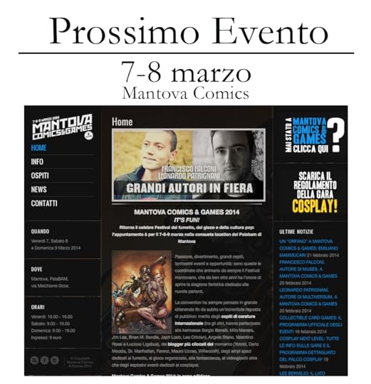 Cari amici e appassionati di fantasy, si apre la stagione degli eventi con il fantastico Mantova Comics.Allo stand con me ci saranno gli autori Marta Leandra Mandelli, Simona Cremonini e Roberto Fontana, insieme agli illustratori Luca Donnarumma e Paolo Linetti.Saremo nella parte centrale del padiglione di fianco allo stand della PANINI e della BONELLI. Cos'altro dire se non VENITE A TROVARCI, vi racconteremo le nostre storie.