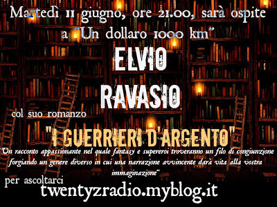 MARTEDì 11 GIUGNO (ovvero DOMANI), ALLE ORE 21.00, a !Un dollaro 1000 kM! sarà ospite ELVIO RAVASIO, autore di romanzi fantasy, che ci presenterà il suo ultimo lavoro, tra l'altro online anche in lingua inglese, "I GUERRIERI D'ARGENTO"! Questo (http://iguerrieridargento.blogspot.it/) è il link del suo blog dove potete cominciare ad avere qualche anticipazione! Per il resto vi aspettiamo domani sera!;) Come al solito, PER ASCOLTARCI BASTA CLICCARE SU: http://twentyzradio.myblog.it/ — con Elvio Ravasio