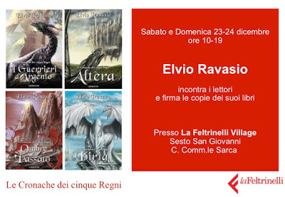 Ecco il prossimo firma copie. Alla Mondadori di Casale Monferrato, terra di prodotti dalla qualità eccelsa, vi aspetto per firmarvi le copie da mettere sotto l'albero. Completate la saga de "Le cronache dei Cinque Regni" o iniziatela con il primo libro "I Guerrieri d'Argento" vivete un magico Natale popolato di Draghi, Magia, Avventura e poteri soprannaturali.