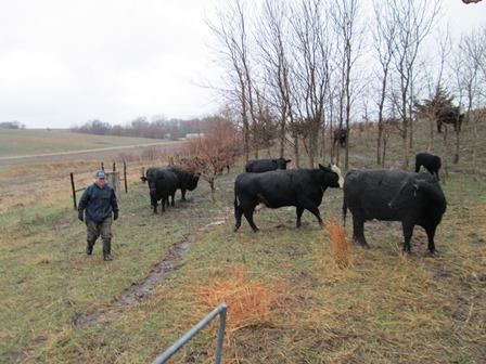 Here's My Cowboy walking through the herd, they gathered in a south west corner, by some spindly trees because the wind is a bit less there, still not exactly toasty. My Cowboy was looking for 709. That's a cow with an ear tag that says 709, thus the name.