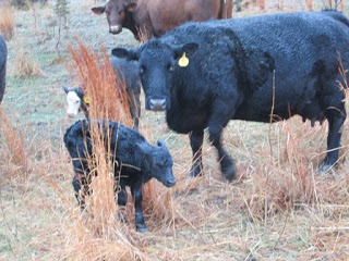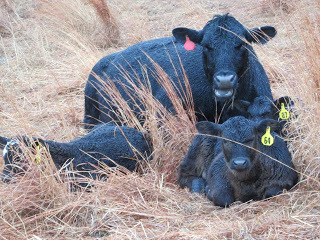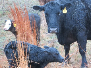 Here are three calves all huddled together with one mama. I thought that was sort of odd. I'd have thought a mama would huddle with her own calf only, but apparently heat is to be savored no matter how close the relationship.Wise cow (the moron cow comes later-hang in there)