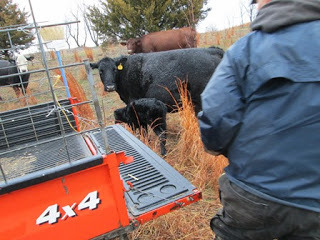 Then the rodeo begins. (I returned to the Kubota at this point) My Cowboy did his part, hoisting the wriggling, soggy little guy into the truck bed, but MAMA WENT NUTS. You have NEVER heard such bellowing. Like the meanest El Toro you've ever heard. And then, when we had the calf all penned up and My Cowboy had leapt out of the truck bed, run around the Kubota on the side the cow was NOT on and jumped in, to lead the parade home. MAMA MORON RUNS MAD. I mean like she runs AWAY. She SPRINTED straight away from us. "But WAIT, come back!"No, she's searching EVERYWHERE for the baby. "But you were right HERE. You SAW us put him in the Kubota pen."We tried.We really did.We went after her, tried to get the Kubota close so she could see her baby, instead, she SPRINTED back to the far corner of the pasture to SEARCH SOME MORE.So ... we debated a long time, and by WE I mean I sat while My Cowboy mutter things best not typed here. He didn't want to separate cow and calf overnight for fear MAMA MORON will forget she ever had a calf. (they do that when you least expect it!) But he didn't want to leave it out there shivering, even though he fed it so it's tummy was full of warm milk.So, we brought him into the barn.We will reunite mama and baby tomorrow, which may be Rodeo Part II.