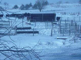 The cows across the road from my house. I'm taking this from my front steps, the briefest possible exposure to the elements. My Cowboy has been out pushing snow all morning, since before I got up.He's shipping calves today, for an auction tomorrow so he had to get a semi-truck up to these gates! Then travel on roads that we HOPE are clear and not slick.