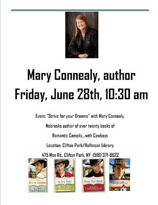 Mary Connealy will be speaking at the Clifton Park/Halfmoon Library on 6/28/2013 at 10:30 am. Clifton Park/Halfmoon Library, 475 Moe Road, Clifton Park, NY 12065This poster is courtesy of a lovely woman named Cynthia Lovely from the Clifton Park area.