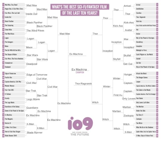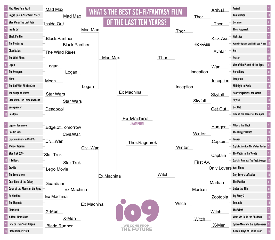 iO9 recently released a bracket to determine the best Sci-Fi film of the last ten years. My wife and I had a great time filling it out (we got different results). The results of my match-ups are below.