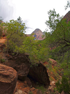 Here is a photo which I took a while ago, while we were in Utah, at Zion National Park. The photo is all right, but what is it a photograph OF? Well, there are trees, rocks, mountains and sky. But it is not actually a photo of anything in particular. Because it is actually a photo which incorporates all the elements into a design, which is truly nonverbal. If you look at the colors, and the design, without thinking of those particulars, then you get what I got, as I looked into the viewfinder, and snapped the picture.