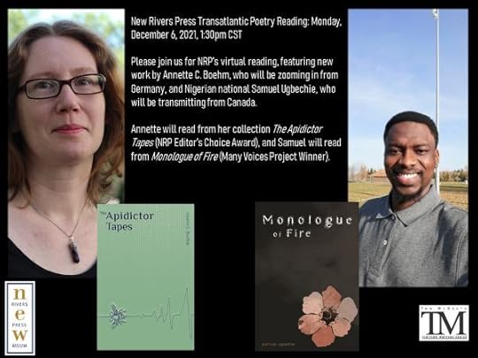 I hope you’ll join us on Monday, December 6th, for a transatlantic virtual poetry reading! There will be new poetry, hot off the press, followed by a Q&A. Us, that’ll be Samuel Ugbechie and myself, plus of course the nice folk from New Rivers Press. Here are the details for the reading: