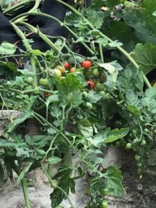 Meanwhile, the first blight showed on the tomatoes yesterday and this morning I finished removing all the foliage from the plants. This won’t halt the progress of the blight, but might slow it enough to give the fruit a chance to ripen. As it is, this year’s crop has been poor – a combo of indifferent weather and my lack of attention due to The Broken Leg. Still, what there are might make a few jars of green chutney.