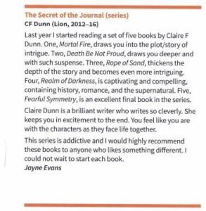 My lovely editor at Lion Fiction has just alerted me to a great review of THE SECRET OF THE JOURNAL series in April’s Woman Alive magazine. It’s reviews like this that keep an author happily scribing into the wee small hours, day in, day out.