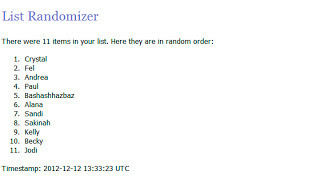 Happy Wednesday, good people of the blogosphere! Here we are on day 3 of my lovely 12 days of Christmas giveaway. What better way to get over the Wednesday blues than by winning something awesome? Congratulations to Crystal Marcos and Fel Wetzig! You've both won copies of every one of my books! I'll be in touch shortly to find out how to get you your prizes. Here are the screenshots from random.org for today's drawing: